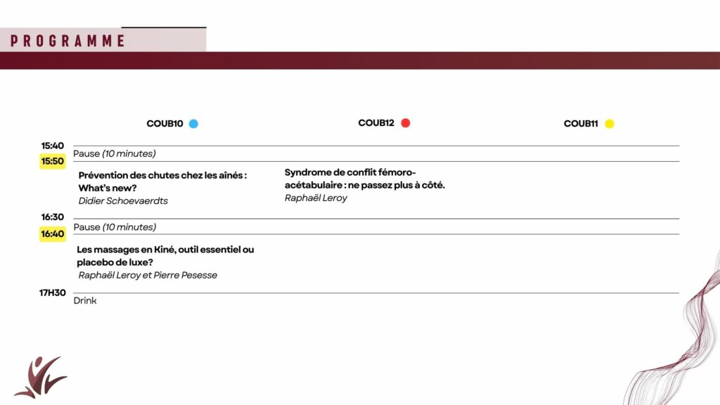 Les « Talks » sont des conférences d’une durée comprise en 30 et 45 minutes (avec un temps d’échange en fin de présentation). Les orateur·ices discutent de leur vécu de thérapeute et des défis de notre profession. Ces présentations servent également à la découverte de thématiques plus méconnues mais indispensables au traitement des patients.
