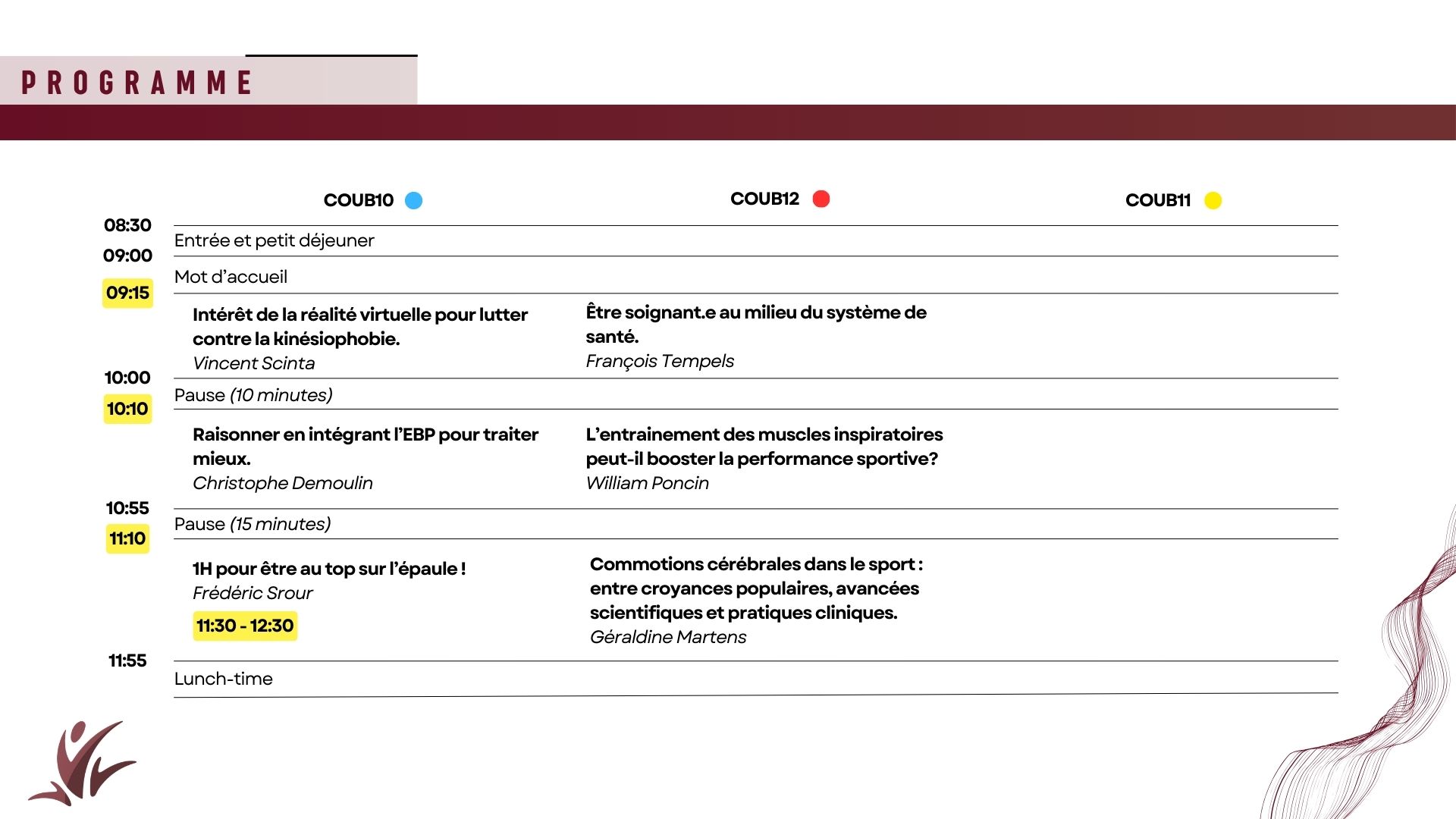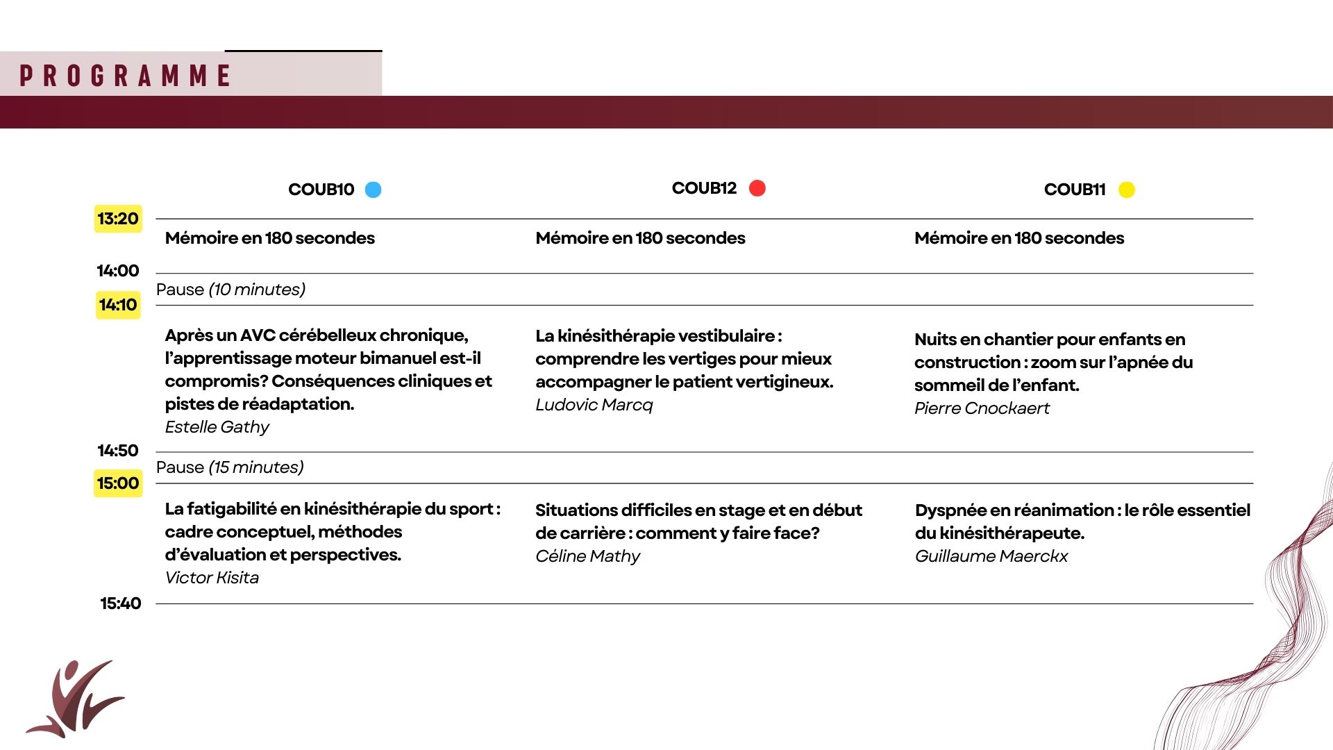 Les « Talks » sont des conférences d’une durée comprise en 30 et 45 minutes (avec un temps d’échange en fin de présentation). Les orateur·ices discutent de leur vécu de thérapeute et des défis de notre profession. Ces présentations servent également à la découverte de thématiques plus méconnues mais indispensables au traitement des patients.