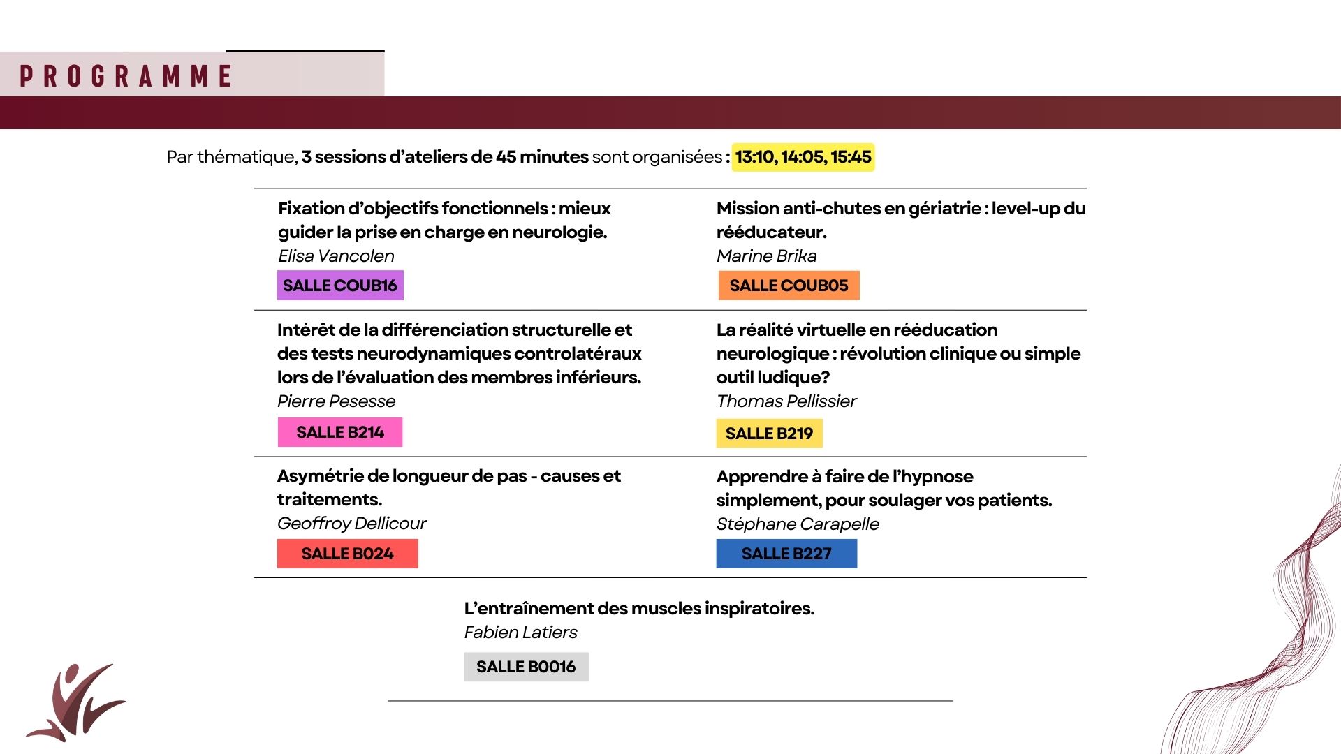 Les « Ateliers » (TP) sont organisés en nombre réduit afin de pouvoir vous exercer activement sur des thématiques particulières. Chaque congressiste choisira un atelier parmi ceux proposés.